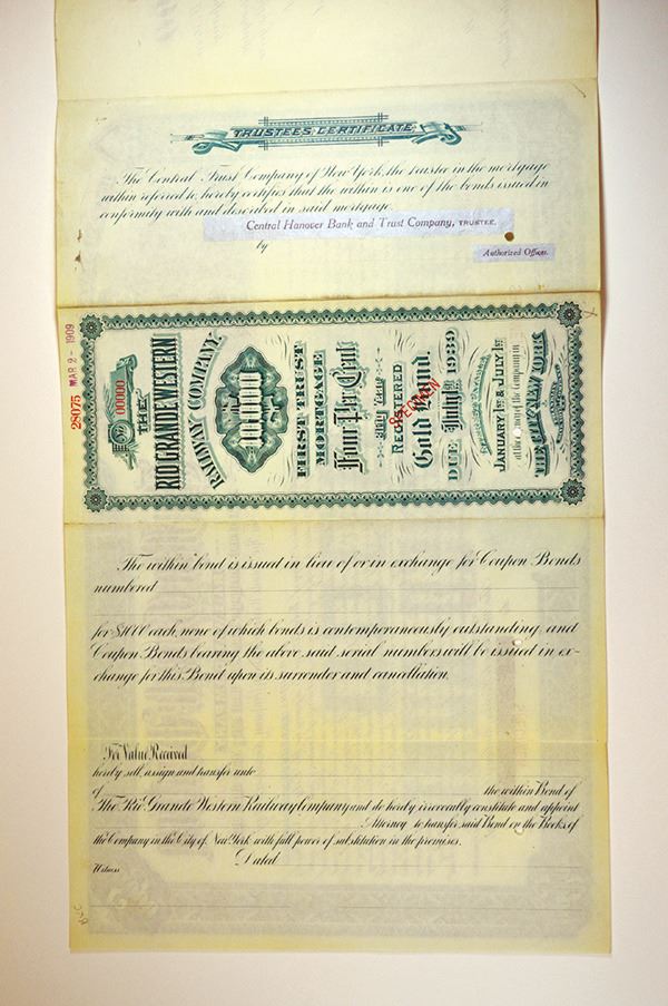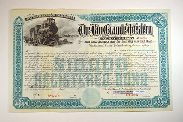 Colorado and Utah. Specimen 1889. $1000. Green border and undertint. Locomotive #188 approaching L-R with harbor scene in background. XF condition. Red specimen overprint and POC's. Franklin BNC. The original Denver and Rio Grande Western Railway built a narrow gauge line from Ogden, Utah via Soldier Summit, Utah to Grand Junction, Colorado. The railroad became the Rio Grande Western Railway in 1889 as part of a finance plan to upgrade the line from narrow gauge to standard gauge, and built several branch lines in Utah to reach lucrative coal fields. One of only 3 found in archives, stunning appearance and rare. Only known as specimen.