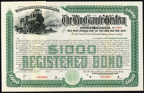 19xx, Specimen Bond, $1000, 1st Trust Mortgage 4%, 50 Year Gold Specimen Bond, Large vignette of moving locomotive l-r top left, POC's, VF-XF condition, FBNC.