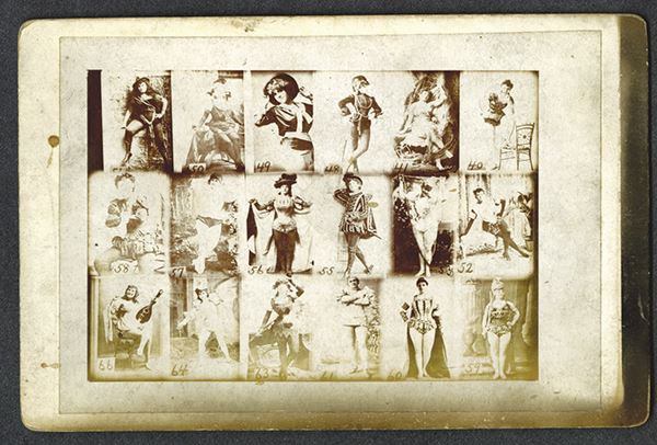 Risqué photos on multiple image card with numbers. No nudes, just well dressed females. This seems like a salesman's order card of available prints for use by a traveling salesman. 5-1/2 x 3-7/8 photographic paper mounted on larger card.