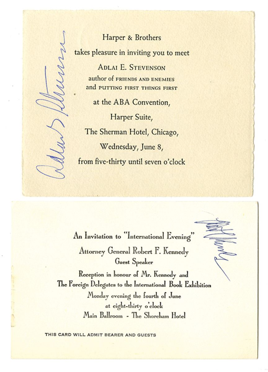 ND, ca.1950-60s, Lot of 2 hand signed autographed invitations to formal dinners held in honor of prominent American statesmen: Robert F. Kennedy, U.S. Attorney General and Senator, and Adlai E. Stevenson II, U.N. Ambassador and two-time Democratic presidential nominee. XF to AU condition. Both events were held in different years, not together, (2). Sold "AS IS" no returns accepted.