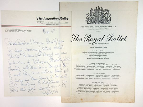 Australia. 2 Pieces. 1). Letter from Robert Helpmann on Australian Ballet stationary describing his new production of "Sleeping Beauty" and, 2). Royal Ballet signed program by Robert Helpmann - credited as Choreographer. Both pieces are in VF-XF condition.