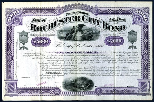 Rochester, New York. 1888, $5000 Specimen Bond, Ornate Purple border with eagle and seated pioneer with waterfall and industrial buildings behind them, bottom has agricultural implements and wheat. Specimen overprints and POC's, XF, ABNC. Scarce and very attractive bond.