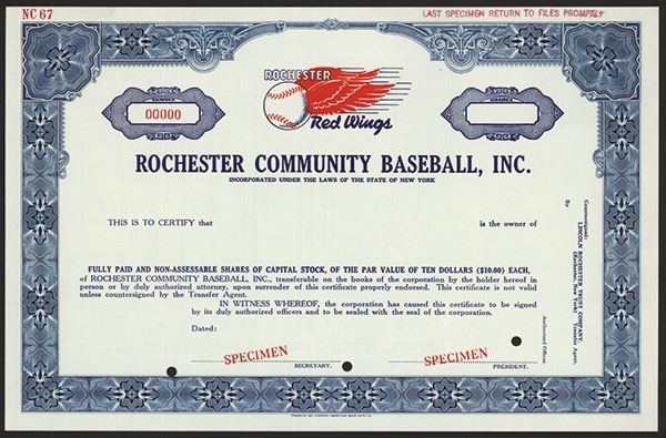 New York, ND, Specimen Stock, Odd Shares, Black on blue border and underprint, Team logo top center, Red SPECIMEN overprints POC's and red s/n "00000", VF-XF condition, FLABNC.