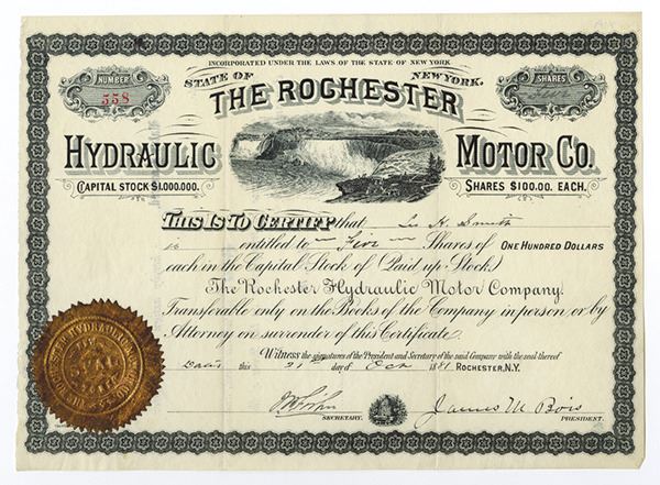 Rochester, New York, 5 Shares, I/U, Black with view of river and waterfall on top, gold foil seal at lower left, the company was formed to develop a compressed air powered street car to replace steam power. Signed by James M. Bois as president. The company secured the rights to the lower falls of the Genesee River and developed machinery to convert the water power to compressed air. After a successful test on a short 1 block track, it was hoped to be Rochester's first pneumatic streetcar. After the test, the company basically disappeared and was not referenced again in local papers of that period. Possibly unique and interesting railroad related certificate.