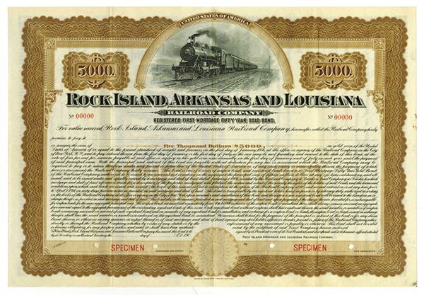 Louisiana & Arkansas, Horizontal format $5000 Specimen First Mortgage Registered Gold Bond Due 1956, Brown frame and underprint, locomotive right to left passing fields and telegraph poles, specimen overprints, POC's, ABNC, EF.