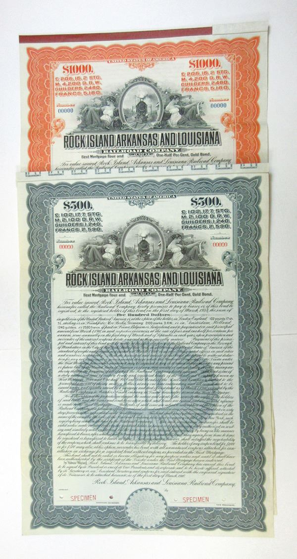 Louisiana and Arkansas. Lot of 2 bonds, both vertical bonds Denominated in Dollars, Pounds, Marks, Guilders and Francs. Includes $500, blue and $1000, orange, both First Mortgage 4 1/2% Specimen Gold Coupon Bonds with head on view of locomotive in circular frame flanked by allegorical women, VF condition, ABNC. The $500 is an unlisted color, both are rare and only known as Specimens in Cox.