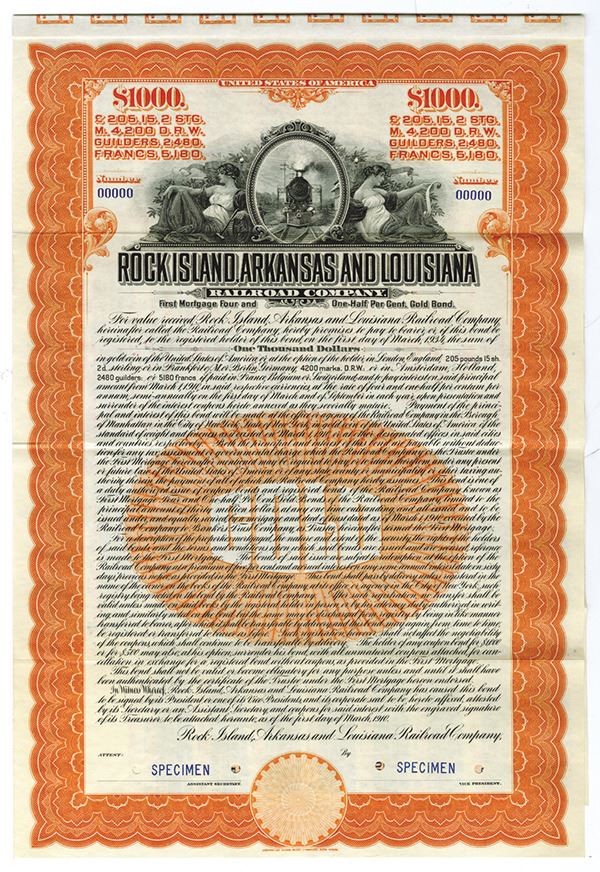 Louisiana & Arkansas, 1910, $1000 (Additional denominations in Pounds Sterling, Guilders, Francs, Marks), 1st Mortgage 4 1/2% Gold Coupon Bond, Black on orange border and underprint, Locomotive head on flanked by allegorical women, VF condition, ABNC. Unlisted as a coupon bond in Cox.