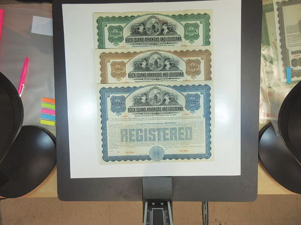 Arkansas & Louisiana. Lot of 3 Specimen bonds, all are horizontal Registered bonds denominated in Dollars, Pounds, Marks, Guilders and Francs. All with the same design and format, Includes $1,000, Green; $5000, Brown and $100,000 blue borders and underprints, All are 4 1/2% Registered 1st Mortgage Gold Bonds, Locomotive head-on flanked by allegorical women. Specimen overprints, POC's, VF/XF condition, ABNC. All are rare as specimens.