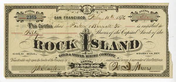 Gold Hill, Storey Co., Nevada. 50 Shares, I/U Black without underprint, ornate title in middle, S/N 2365, The stock would have graded VF but the right margin is slightly cut into. Scarce stock