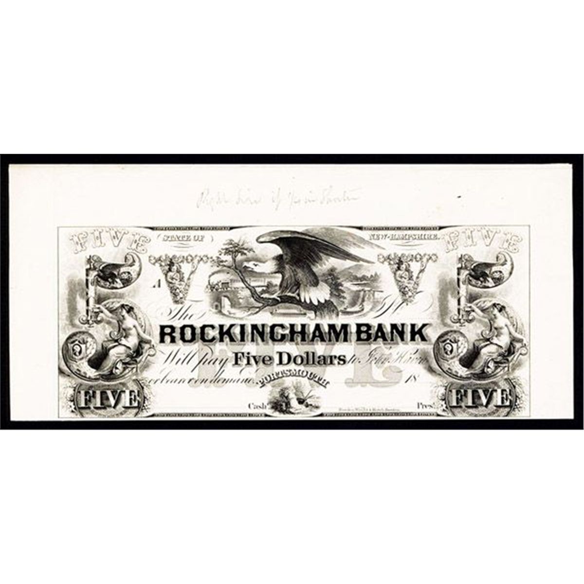 Portsmouth, New Hampshire, 18xx (ca.1830's), $5, Plate A, NH-295-Unknown Design and Issuer, Unlisted in census, Proof banknote, black on india paper on thin white card, Screaming eagle on tree branch with train passing in distance and canal boats in canal in middle top, topless allegorical women sitting on ornate numeral 5 with small portrait of Washington on patriotic shield and cherub sitting on flowery V flanking eagle, underprint FIVE in middle, Choice Uncirculated condition, Rawdon, Wright, Hatch & Co. Boston imprint. Extremely attractive note. (Silver City Collection, Part 2)