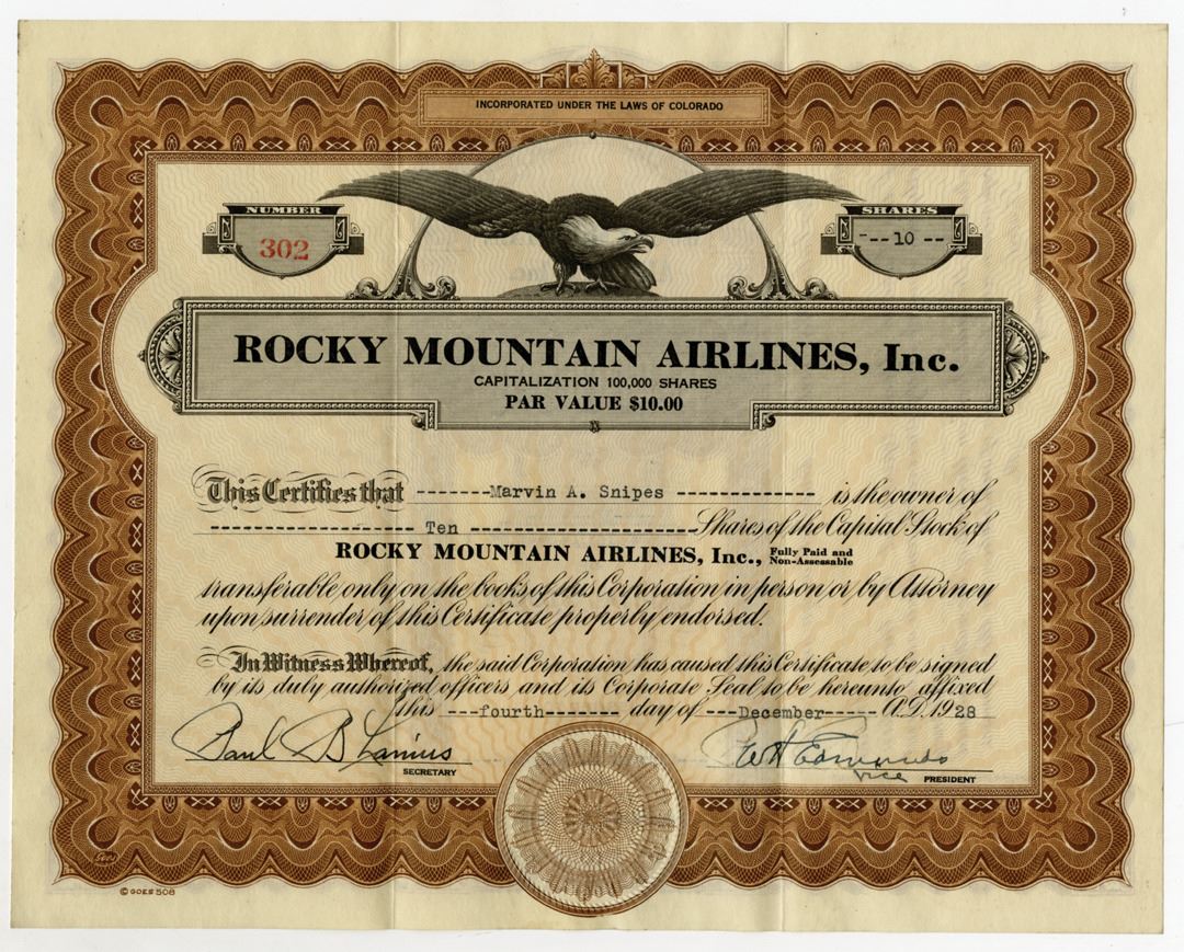Colorado. 10 Shares, I/U stock certificate, Black on brown border, eagle at top, S/N 302, Rare Colorado Aviation certificate. Goes.