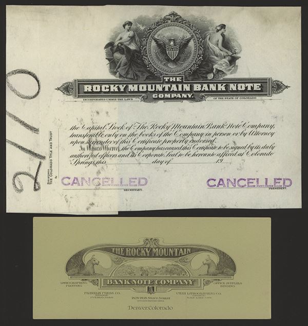 Denver, Colorado, ND (ca. 1900-1920), Lot of 2 items, Includes Proof stock certificate without border and underprint in black, Fine to VF; Also includes black on olive green advertising ink blotter, New. Both rare.
