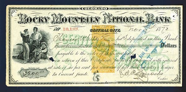 Central City, CO., Nov. 9, 1872, $200, Spindle cancelled, Sailor, blacksmith and reaper on left, U.S. Imprinted Revenue 5 cents, RN-Q1, Madison facing right portrait, VF, Western BNC. Rare revenue.