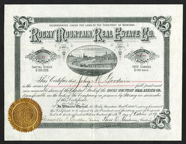 Helena, Montana, 6 Shares, I/U, Black with gold foil seal lower left, ornate title over oval vignette of train passing town, S/N 47, VF condition.