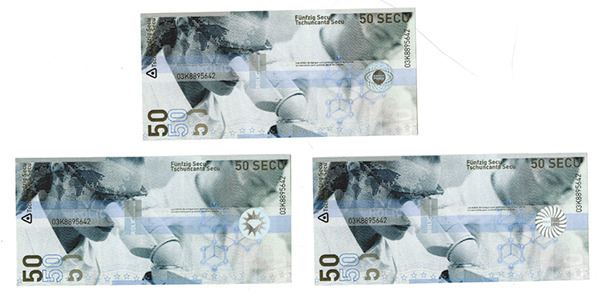 Lot of 3 notes, all bearing the denomination of "50 Secu", each with a different circular hologram at right, scientists working in lab in background. Choice Uncirculated.