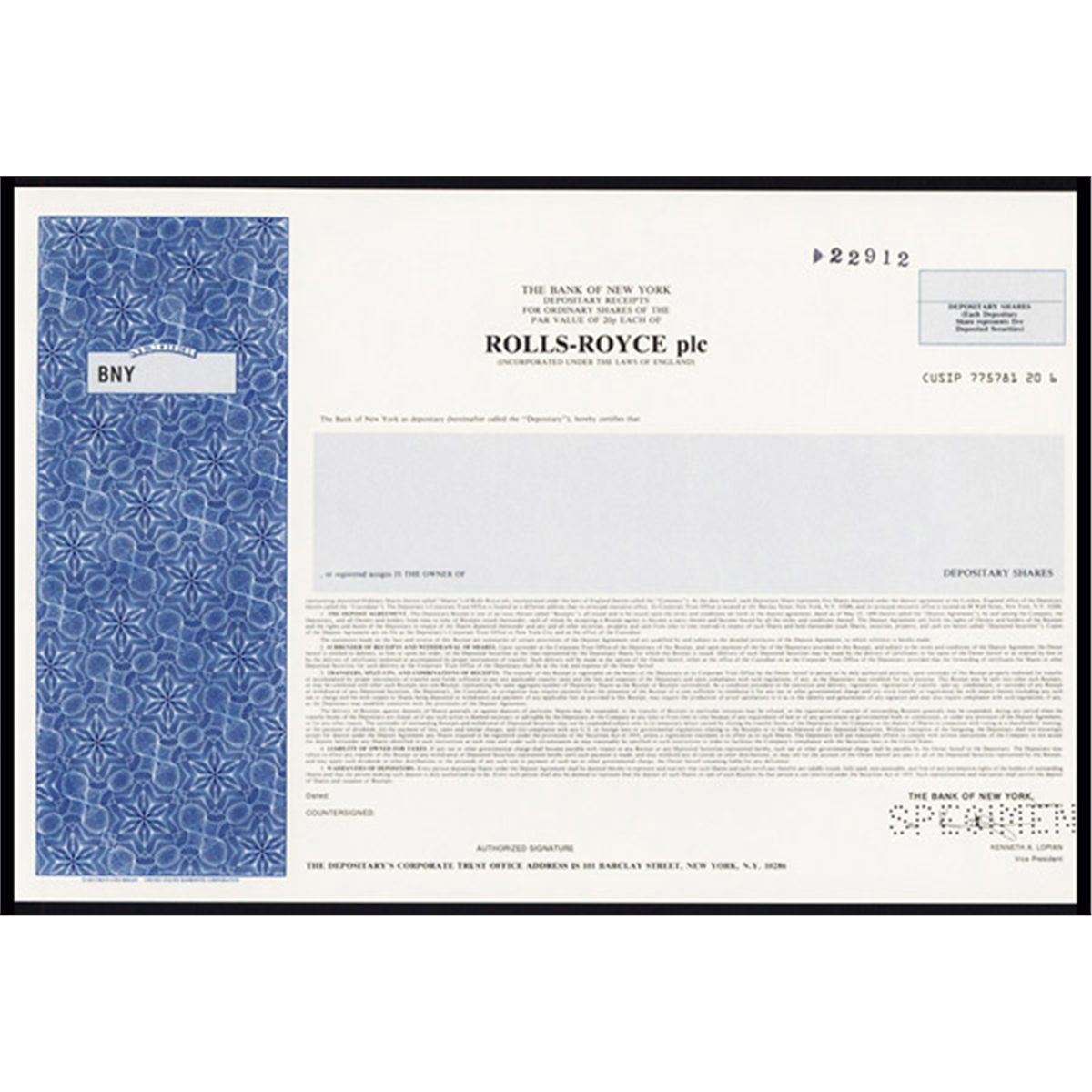 English incorporation, Bank of New York Depositary Receipts for Ordinary Shares, 1990, Specimen, Blue , Pin cancels, XF.