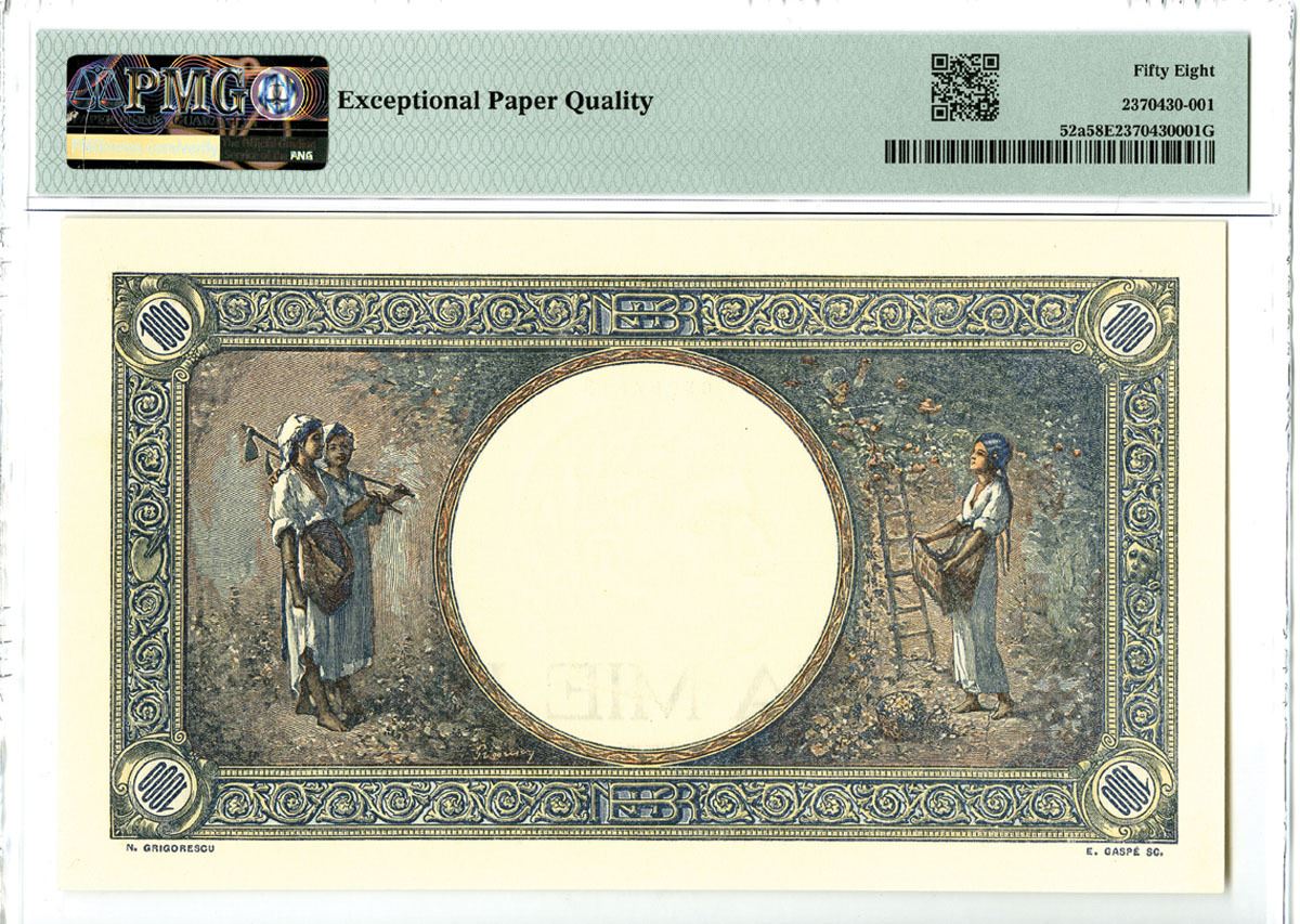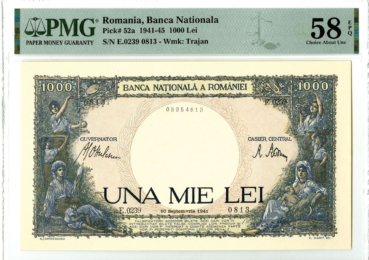 Romania, 1941. 1000 Lei, P-52a, Issued Banknote, Blue and green on pink underprint with two farm wives with three children each at left and right, Back is m/c with faming wives apple picking, S/N E.0239 0813, PMG graded Choice About Uncirculated 58 EPQ.