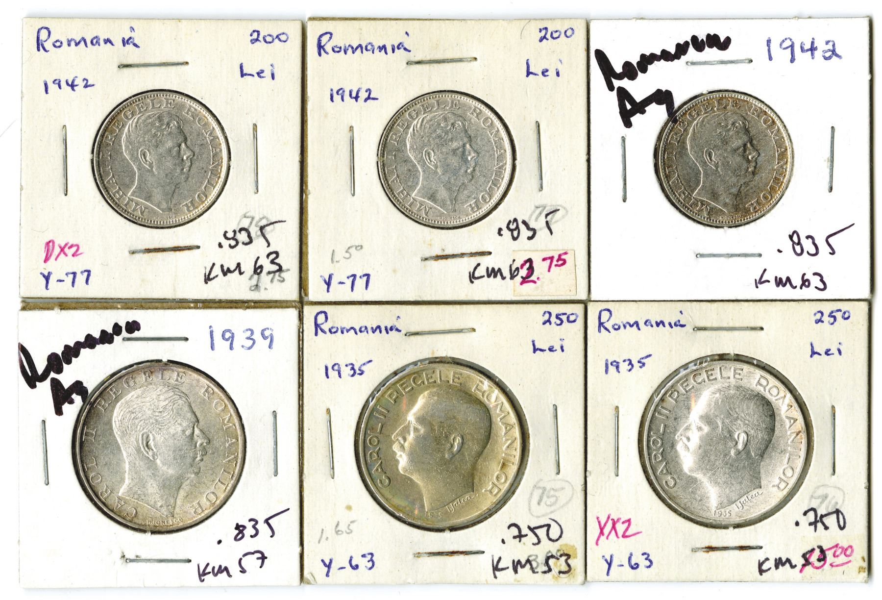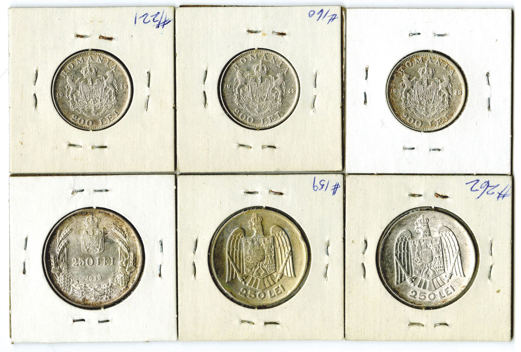 Romaniaƒ... Lot of 6 coins, including; 250 Lei, 1935, KM-53 (2 examples), VF to Choice VF; 250 Lei, 1939, KM-57, Choice XF to AU; 200 Lei, 1942, KM-63 (3 examples), Choice VF to AU condition. (6)