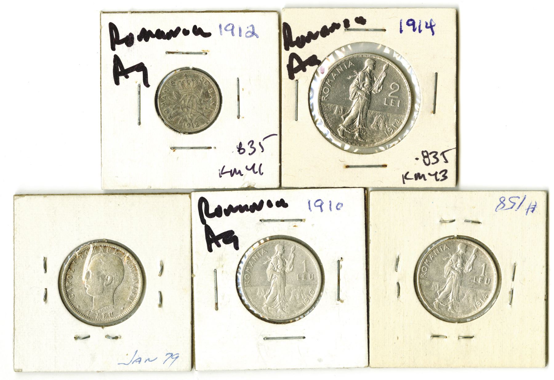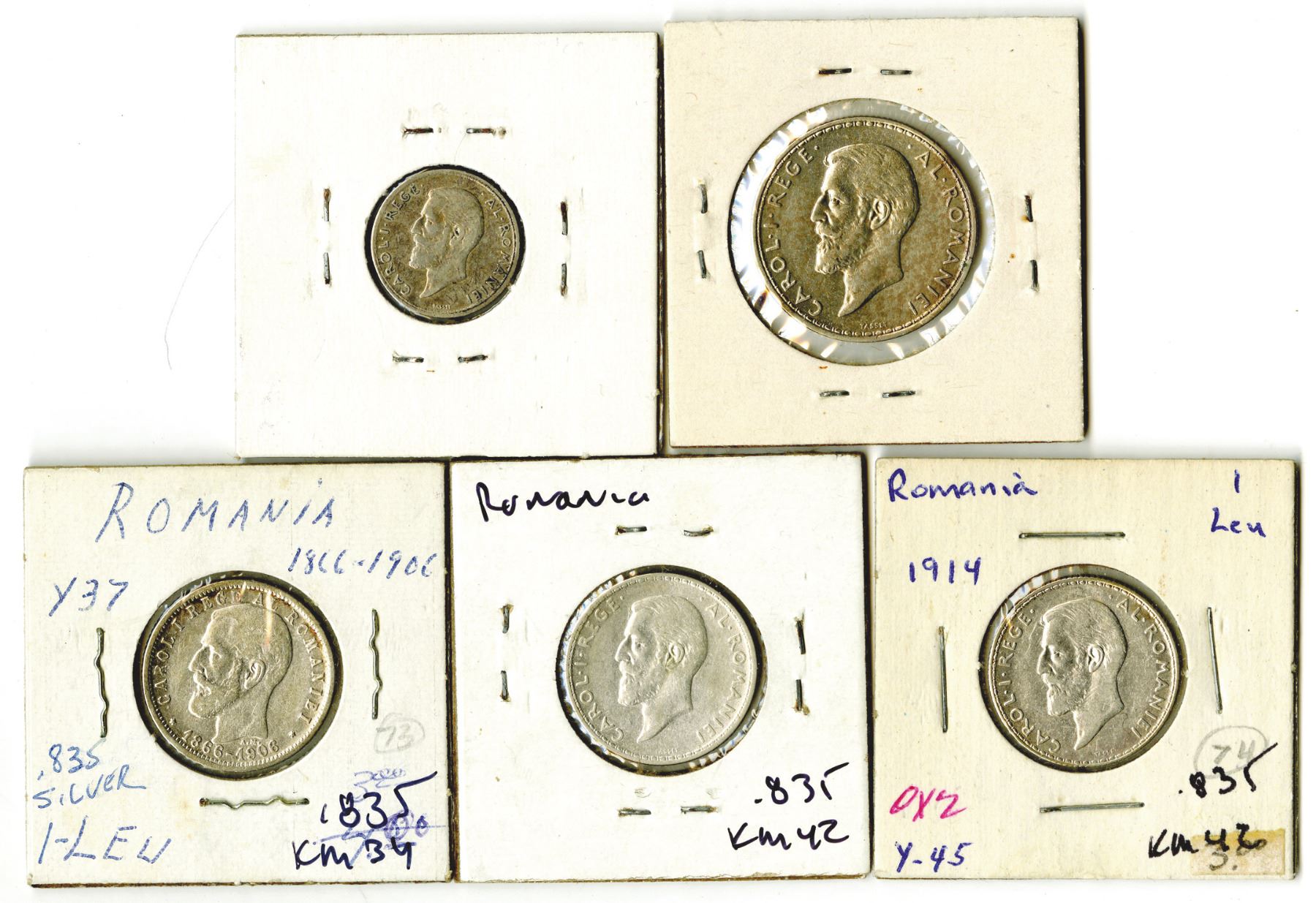 Romaniaƒ.. Lot of 5 coins, including: 1 Leu, 1866-1906, KM-34; 1 Leu, 1910, KM-42; 1 Leu, 1914, KM-42; 50 Bani, 1912, KM-41; 2 Lei, 1914, KM-43. All are Silver .835 coins . (5)