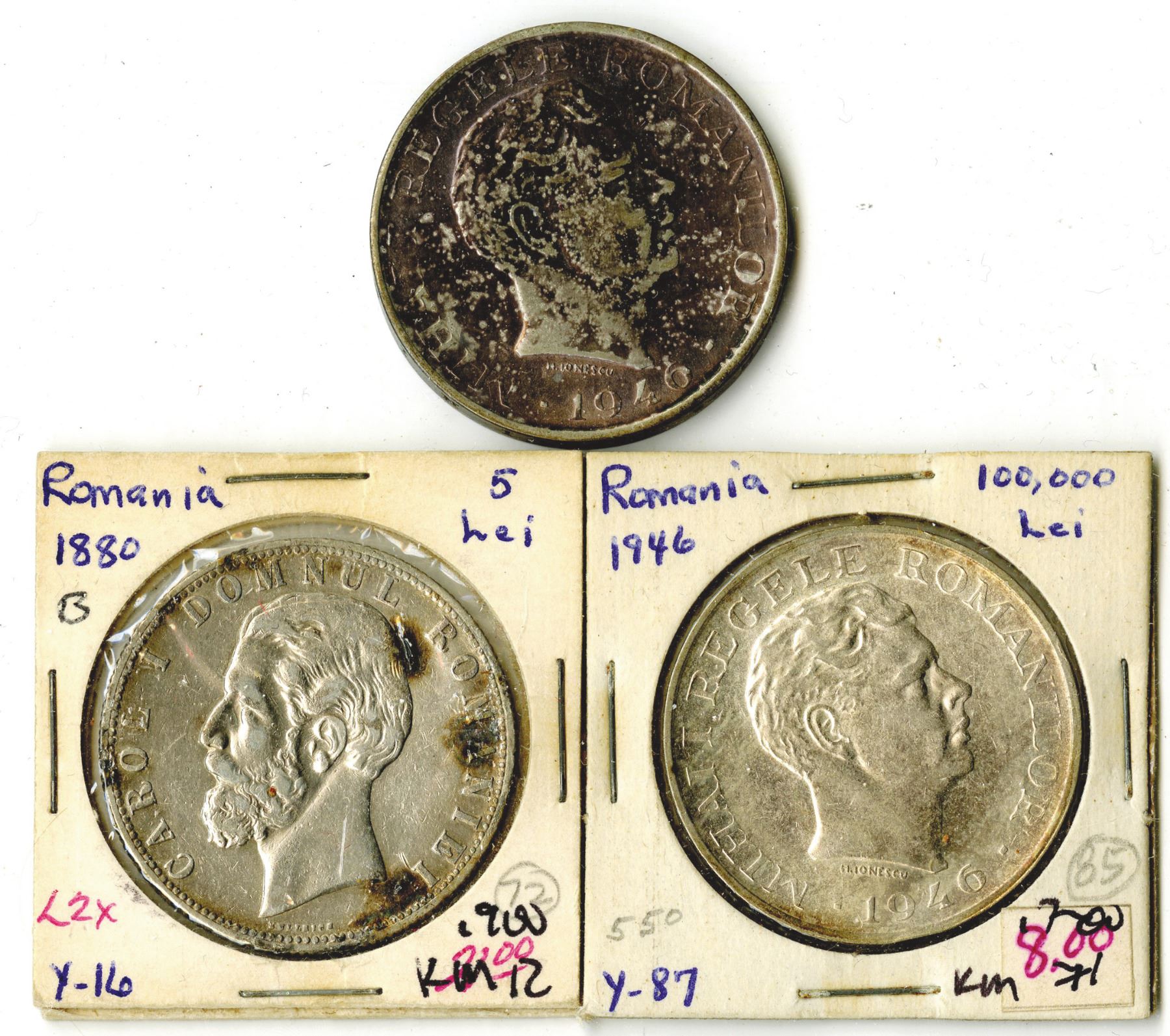 Romaniaƒ.. Lot of 3 coins, including: 100,000 Lei, 1946, KM-71, 2 examples, Choice AU to Uncirculated; and 5 Lei, 1880, KM-12, Choice Fine to VF. (3)