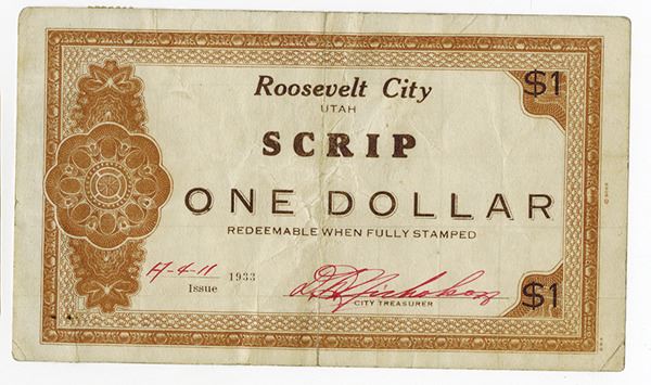 Roosevelt City, Utah, $1, Issued depression scrip, brown with red signature, ornate design element at left, back with stamps, VF. Scarce Utah depression Scrip.