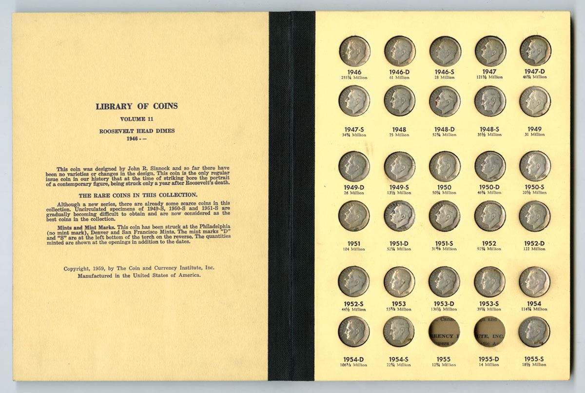 U.S., 1946-61. Library of Coins, Volume 11 album filled with Roosevelt head dimes dated 1946 to 1961, missing 1955 and 1955-D but including additional examples of 1948-S, 1951-S and 1961-D. Lot consists of 43 coins housed in original album, representing a nearly complete early silver-date run with a few duplicates. All coins are struck in .900 fine silver and weigh 2.50 grams per coin, giving a total weight of 107.50 grams for the lot and an actual silver weight (ASW) of 96.75 grams (3.110 troy oz). Coins show typical circulation with varying degrees of wear and toning consistent with album storage. (43). Sold “AS IS” no returns accepted.