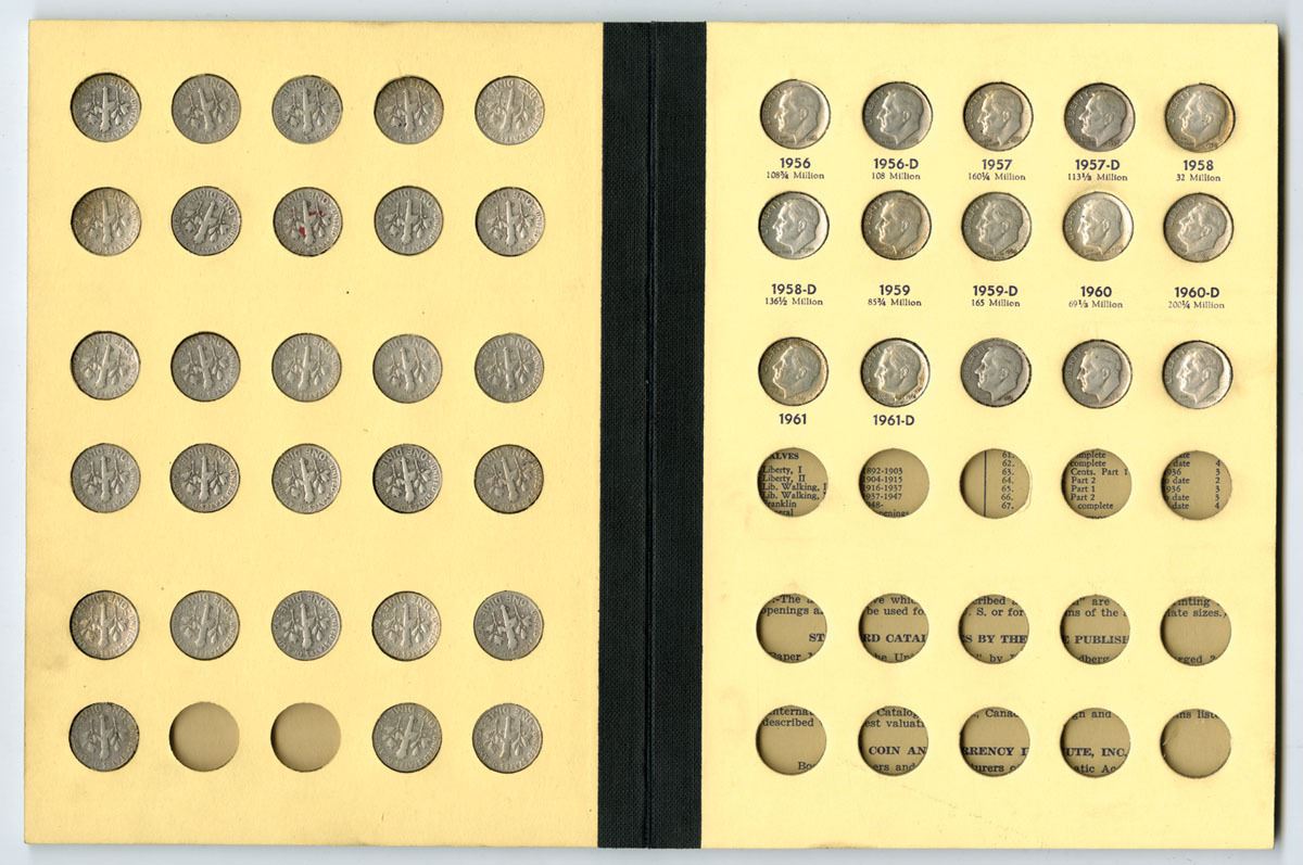 U.S., 1946-61. Library of Coins, Volume 11 album filled with Roosevelt head dimes dated 1946 to 1961, missing 1955 and 1955-D but including additional examples of 1948-S, 1951-S and 1961-D. Lot consists of 43 coins housed in original album, representing a nearly complete early silver-date run with a few duplicates. All coins are struck in .900 fine silver and weigh 2.50 grams per coin, giving a total weight of 107.50 grams for the lot and an actual silver weight (ASW) of 96.75 grams (3.110 troy oz). Coins show typical circulation with varying degrees of wear and toning consistent with album storage. (43). Sold “AS IS” no returns accepted.