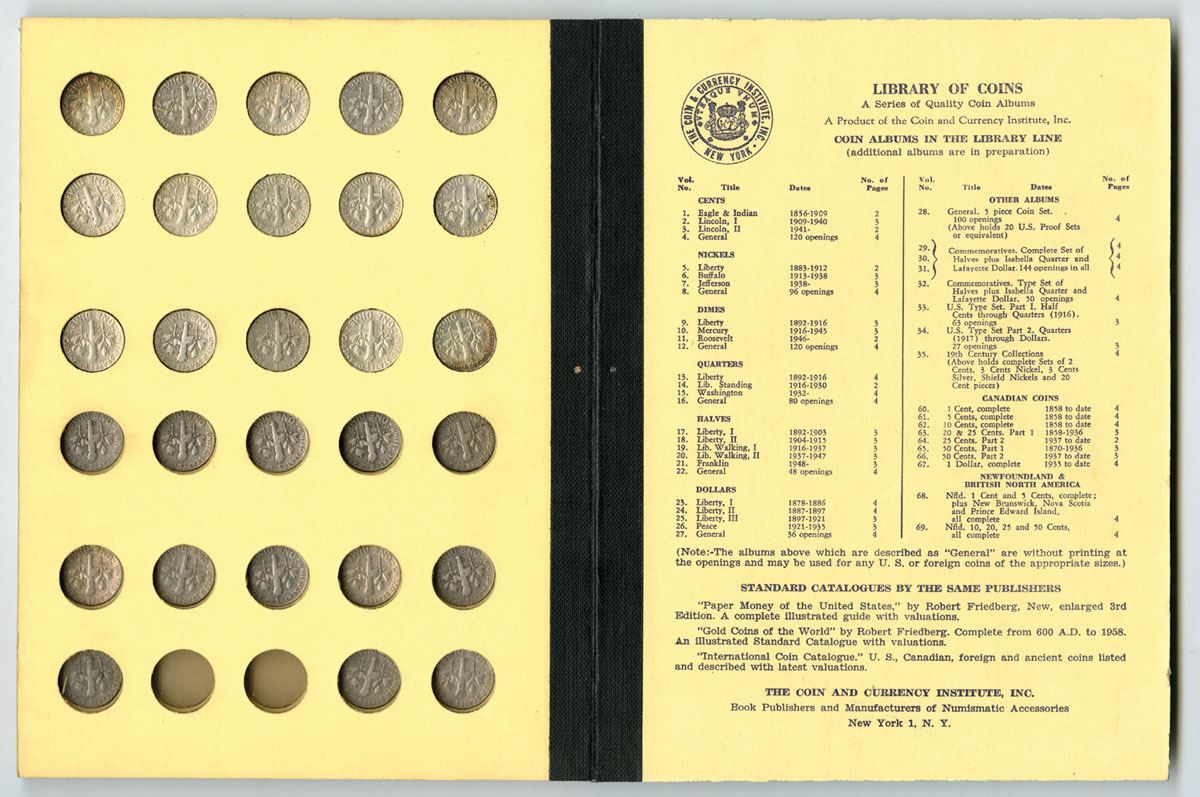 U.S., 1946-61. Library of Coins, Volume 11 album filled with Roosevelt head dimes dated 1946 to 1961, missing 1955 and 1955-D but including additional examples of 1948-S, 1951-S and 1961-D. Lot consists of 43 coins housed in original album, representing a nearly complete early silver-date run with a few duplicates. All coins are struck in .900 fine silver and weigh 2.50 grams per coin, giving a total weight of 107.50 grams for the lot and an actual silver weight (ASW) of 96.75 grams (3.110 troy oz). Coins show typical circulation with varying degrees of wear and toning consistent with album storage. (43). Sold “AS IS” no returns accepted.