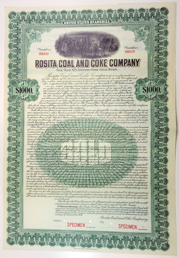 Delaware, 1919. $1000 Specimen 6% Sinking Fund Gold Coupon Bond, Black text with green border and undertint, Men at work in mine at top center. Red specimen overprints, 00000 serial numbers, POCs. VF condition, ABNC. Rosita Coal and Coke owned a large mining operation in Mexico.
