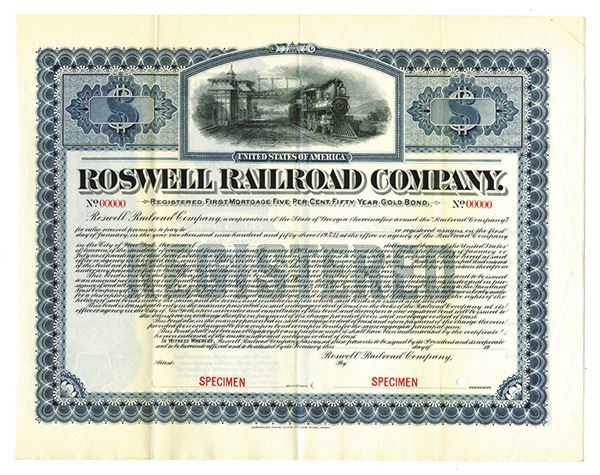 Georgia. 1903, $-Odd, 5% Registered 1st Mortgage 5% 50 Year Gold Specimen Bond, Black printing with blue border and underprint, Moving locomotive under signal tower top center, POC's and red SPECIMEN overprints, VF-XF condition, ABNC. Listed railroad in Cox but no bonds listed just stocks.
