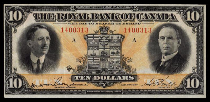 Royal Bank of Canada, 1927 Issue Banknote.Montreal, Quebec, Canada, 1927, $10, P-S1384, 6301408, Issued banknote, black on orange underprint, Canadian Arms at center, Neill at left and Holt on right, S/N 1400313, Wilson / Holt signature variety, PMG graded Very Fine 30, Tears, 1mm tear in left margin that is almost impossible to see otherwise an extremely attractive note for grade with sharp corners and fresh appearance as well as bright colors. Canadian BNC.