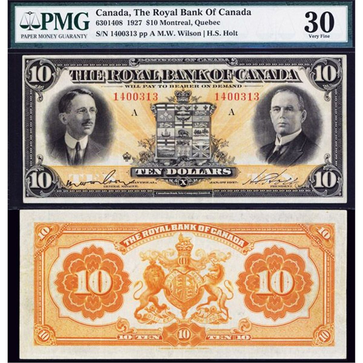 Montreal, Quebec, Canada, 1927, $10, P-S1384, 6301408, Issued banknote, black on orange underprint, Canadian Arms at center, Neill at left and Holt on right, S/N 1400313, Wilson / Holt signature variety, PMG graded Very Fine 30, Tears, 1mm tear in left margin that is almost impossible to see otherwise an extremely attractive note for grade with sharp corners and fresh appearance as well as bright colors. Canadian BNC.