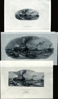 Montreal. Canada 1913. $20. Proof of locomotive vignette used on this banknote with 2 additional variation vignettes of the same vignette but in different sizes, different borders and the light in the wrong place. Printed in black on india paper. Canadian BNC