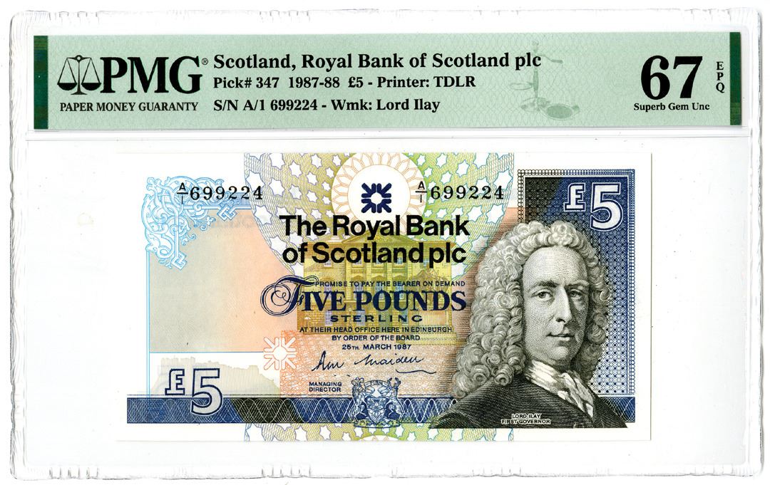 Scotland. 1987. £5, P-347, issued banknote, PMG Graded Superb Gem Unc 67 EPQ, TDLR. Tied with 4 others as highest graded out of 27 graded in the PMG census.