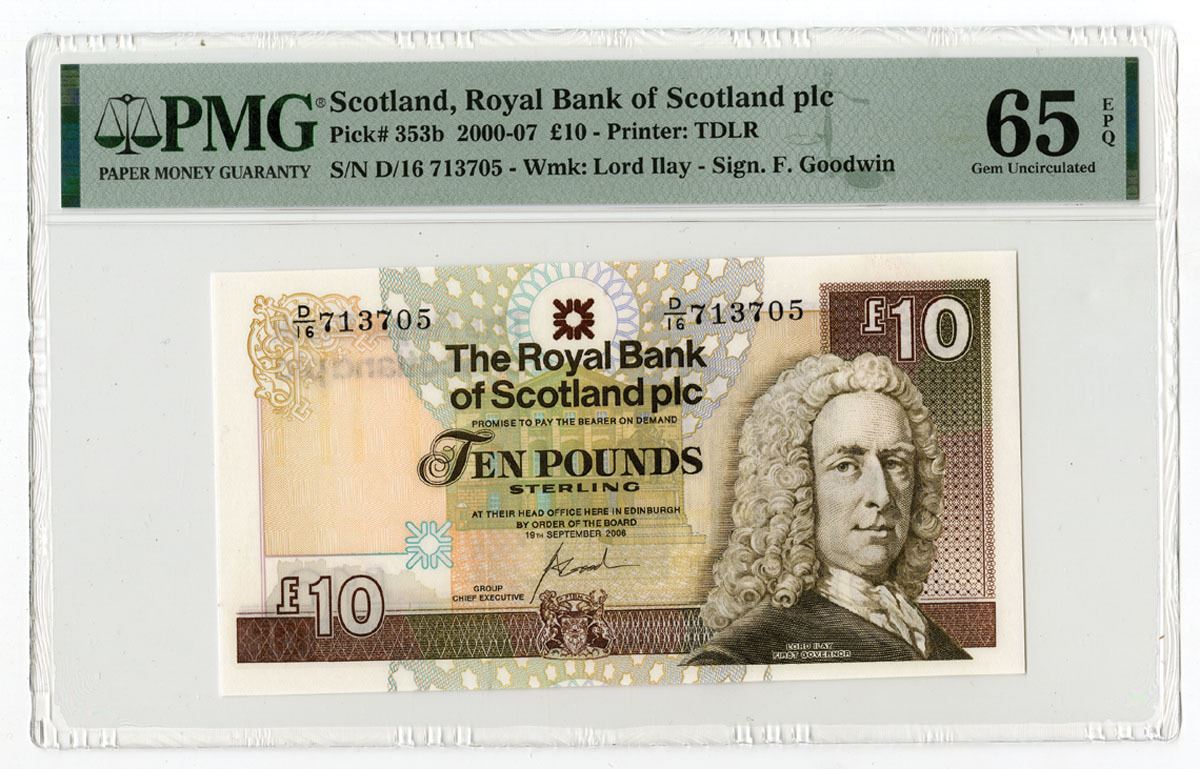 Scotland, 2007. 10 Pounds, P-353b, Issued Banknote, Deep brown and brown on m/c underprint with portrait of Lord Ilay at right, Back is brown with Glamis Castle at center, S/N D/16 713705. PMG graded Gem Uncircular 65 EPQ, TDLR.