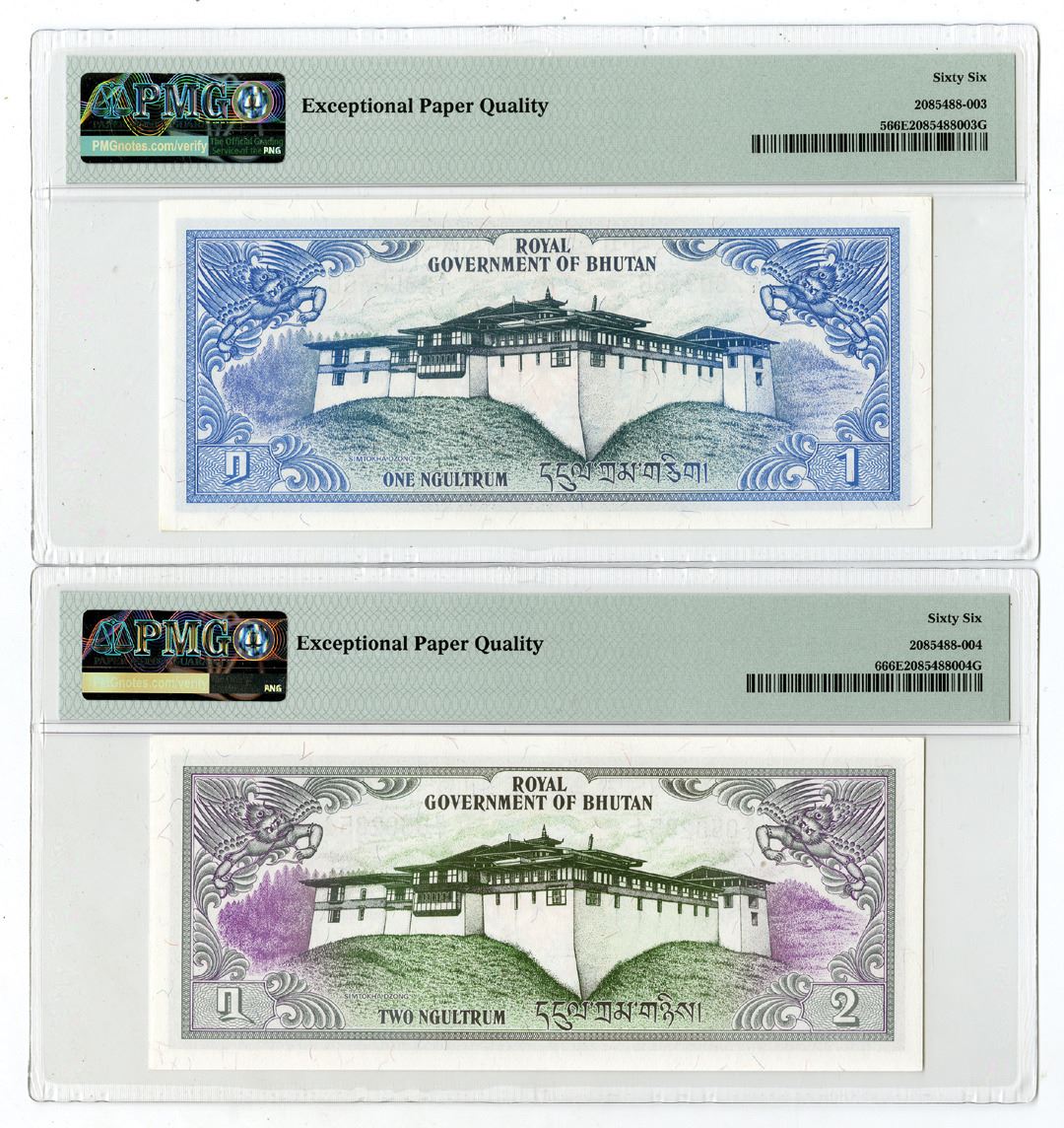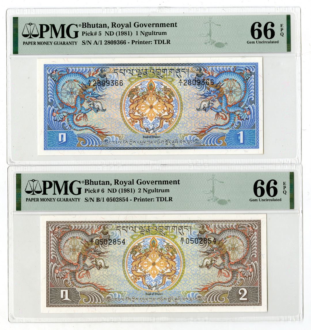 Bhutan, ND (1981). Lot of 2 Issued Banknotes, Includes: 1 Ngultrum, Blue on m/c underprint, Royal emblem between facing dragons at center, S/N A/1 2809366; 2 Ngultrum, Brown and green on m/c underprint, Royal emblem between facing dragons at center, S/N B/1 0502854. Both notes are PMG graded Gem Uncirculated 66 EPQ and were printed by TDLR. (2). Sold "AS IS" no returns accepted.