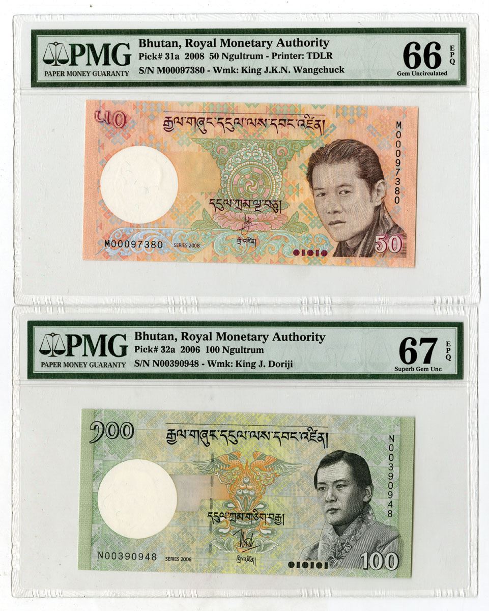 Bhutan. Lot of 2 Issued Banknotes, Includes: 2008, 50 Ngultrum, P-31a, Orange on m/c underprint with King Jihme Doriji Wangchuk at right, S/N M00097380, PMG graded Gem Uncirculated 66 EPQ, TDLR; and, 2006, 100 Ngultrum, P-32a, Black on m/c printing with portrait of King Jigme Doriji Wangchuck at right, Back has Tashiccho Dzong palace at center, S/N N00390948, PMG Superb Gem Uncirculated 67 EPQ. (2). Sold "AS IS" no returns accepted.