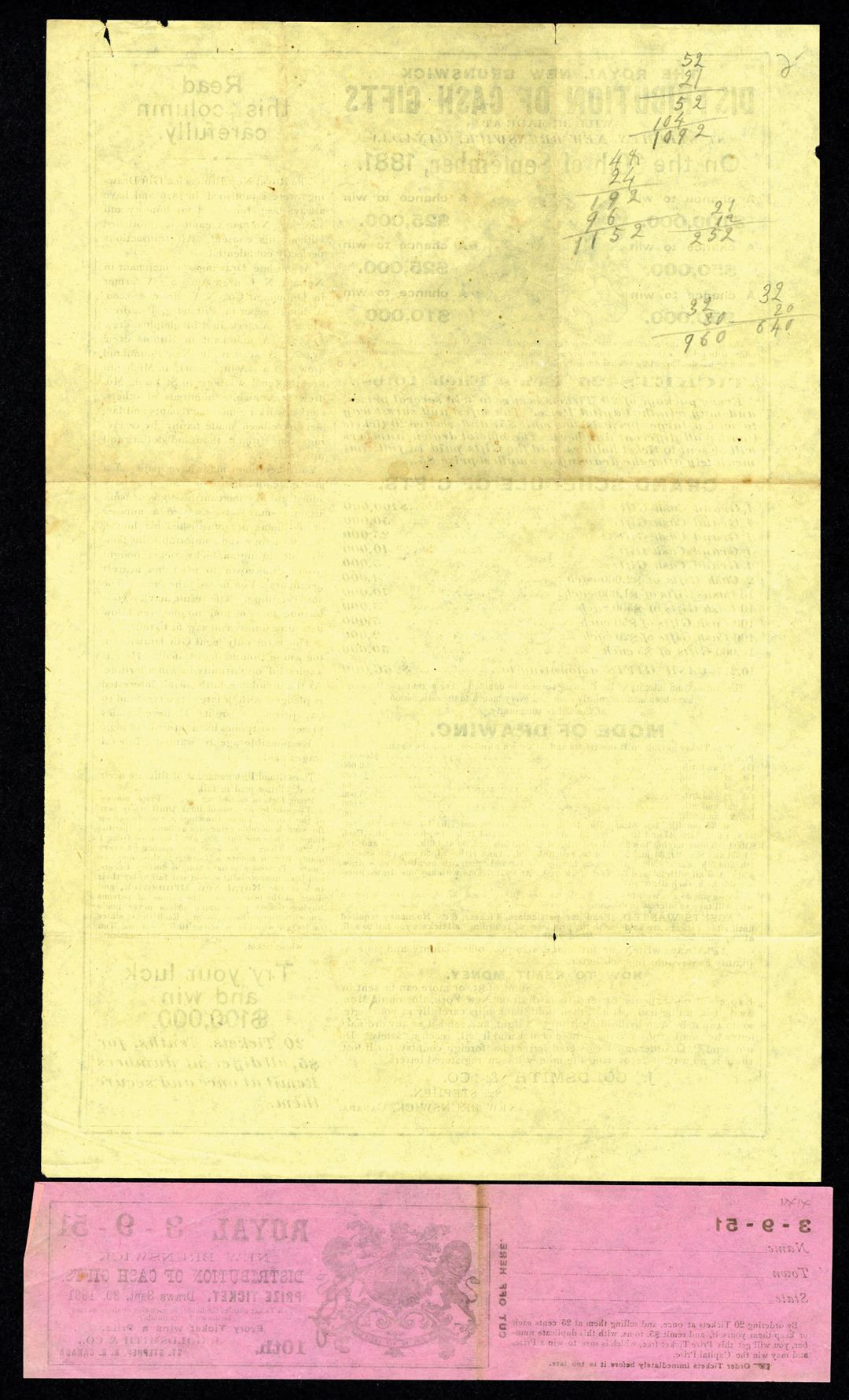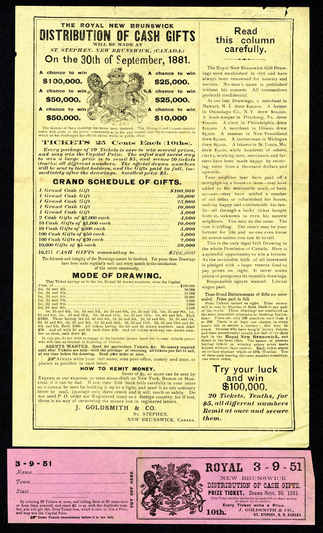 New Brunswick, Canada. Notice from J. Goldsmith & Co. St. Stephen. Lottery broadside with list of prizes and a ticket sample. (2)