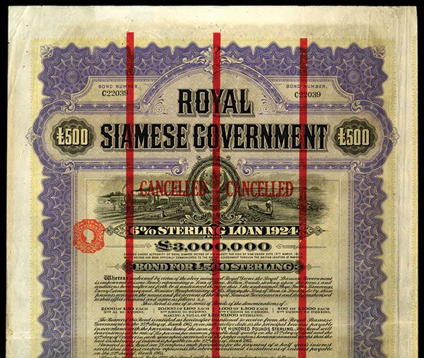 London, England. Issued and Cancelled bond, Black on purple and light yellow, coupons attached, locomotive and man in boat flank Siamese Arms, Red Strips and Cancelled overprints with POC's on the bottom. Red English imprinted revenue on top left, VF condition. Extremely rare and attractive bond. Waterlow & Sons, Ltd.