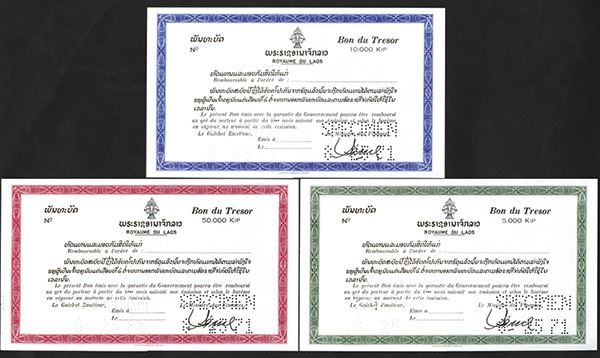 Laos, Lot of 3 notes, Includes 5000 Kip, green; 10,000 Kip, blue and 50,000 Kip, red, all in CU condition, All are pin punched Specimen and dated, Rare circulating bonds, Federated BNC.