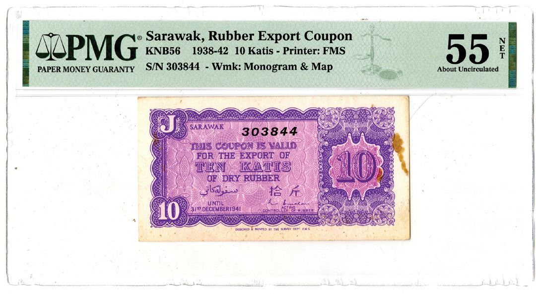 Sarawak... 1938-42. 10 Katis, KNB56, Issued note, Purple and pink on face, S/N 303844, Watermark: Monogram & Map, PMG graded About Uncirculated 55 NET with comment "Rust". Printer: FMS.
