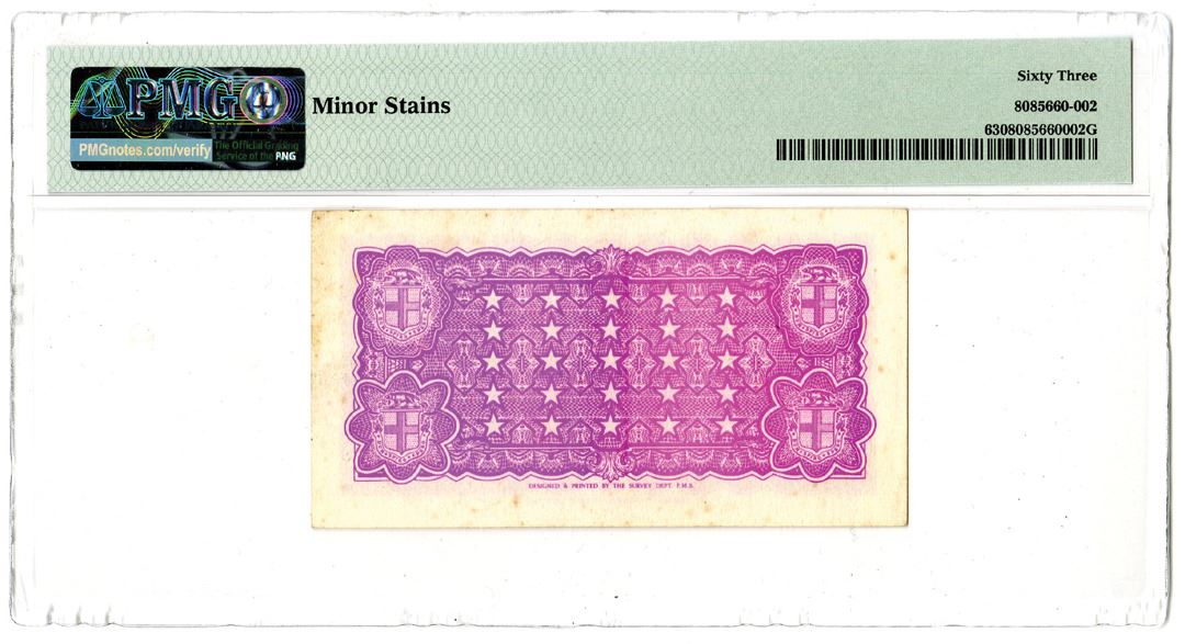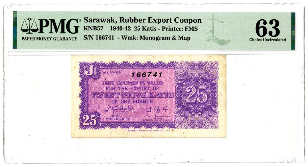 Sarawak... 1940-42. 25 Katis, KNB57, Issued note, Purple and pink face, S/N 166741, Watermark: Monogram & Map, PMG graded Choice Uncirculated 63 with comment "Minor Stains". Printer: FMS.