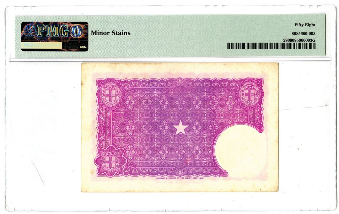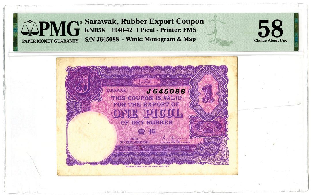 Sarawak.... 1940-42. 1 Picul, KNB58, Issued note, Purple and pink on face, S/N J645088, Watermark: Monogram & Map, PMG graded Choice About Uncirculated 58 with comment "Minor Stains". Printer: FMS.