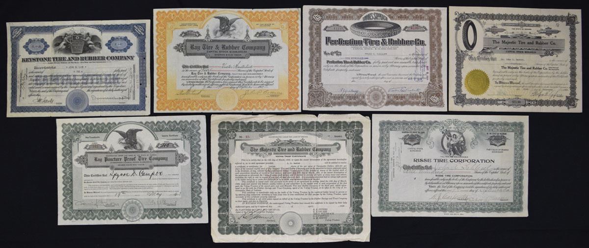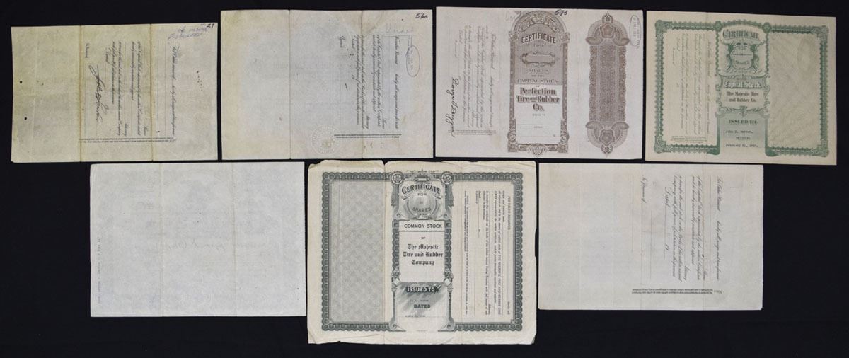 Various States, 1910-30s. Lot of 7 issued certificates. Includes: Keystone Tire and Rubber Co.; Ray Tire & Rubber Co.; Perfection Tire & Rubber Co.; Majestic Tire & Rubber Co.; Ray Puncture Proof Tire Co.; Majestic Tire & Rubber Co. (Voting Trust Certificate); Risse Tire Corporation. Various capital stock formats with embossed and printed seals. Conditions range from F-VF to VF-XF, with typical folds, handling, and edge wear from storage. (7). Sold ‘AS IS’ no returns accepted.