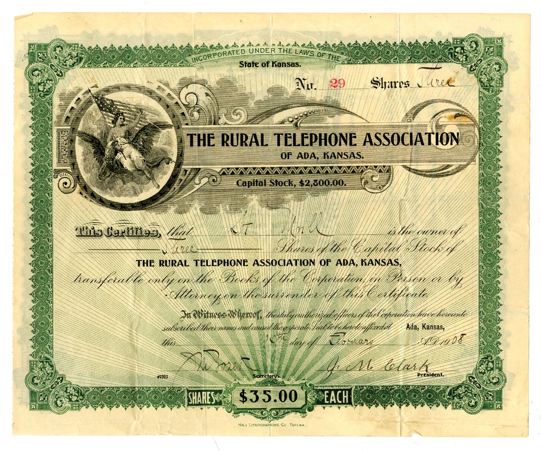 Ada, Kansas, 1908. 3 Shares I/U Capital Stock Certificate, Black on green border and underprint, Allegorical female flying on bald eagle at top left corner, Low serial number: 29, VF condition