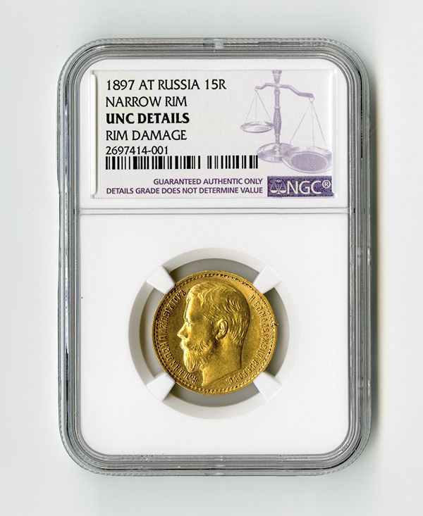 Russia, 15 Rubles, 1897, NGC graded Unc. Details with note of rim damage, still very attractive with a very small nick at 3:00 that is barely noticeable.