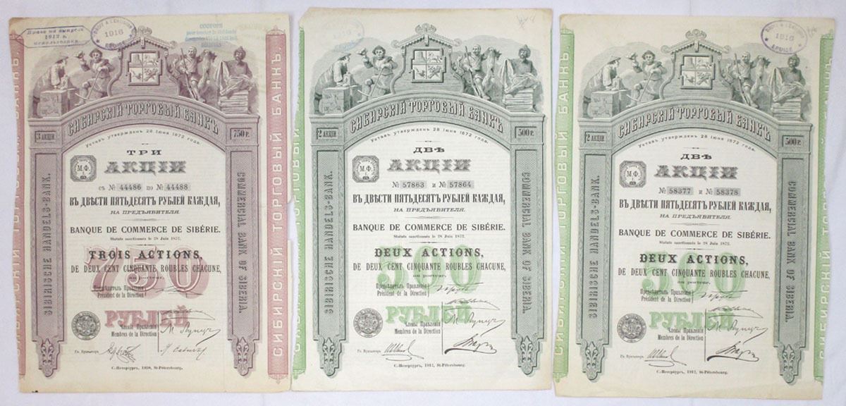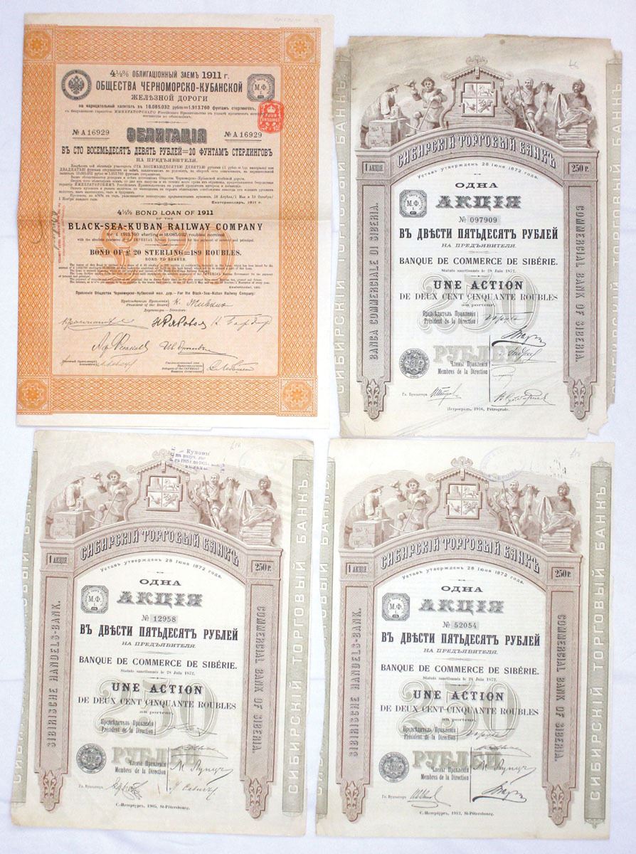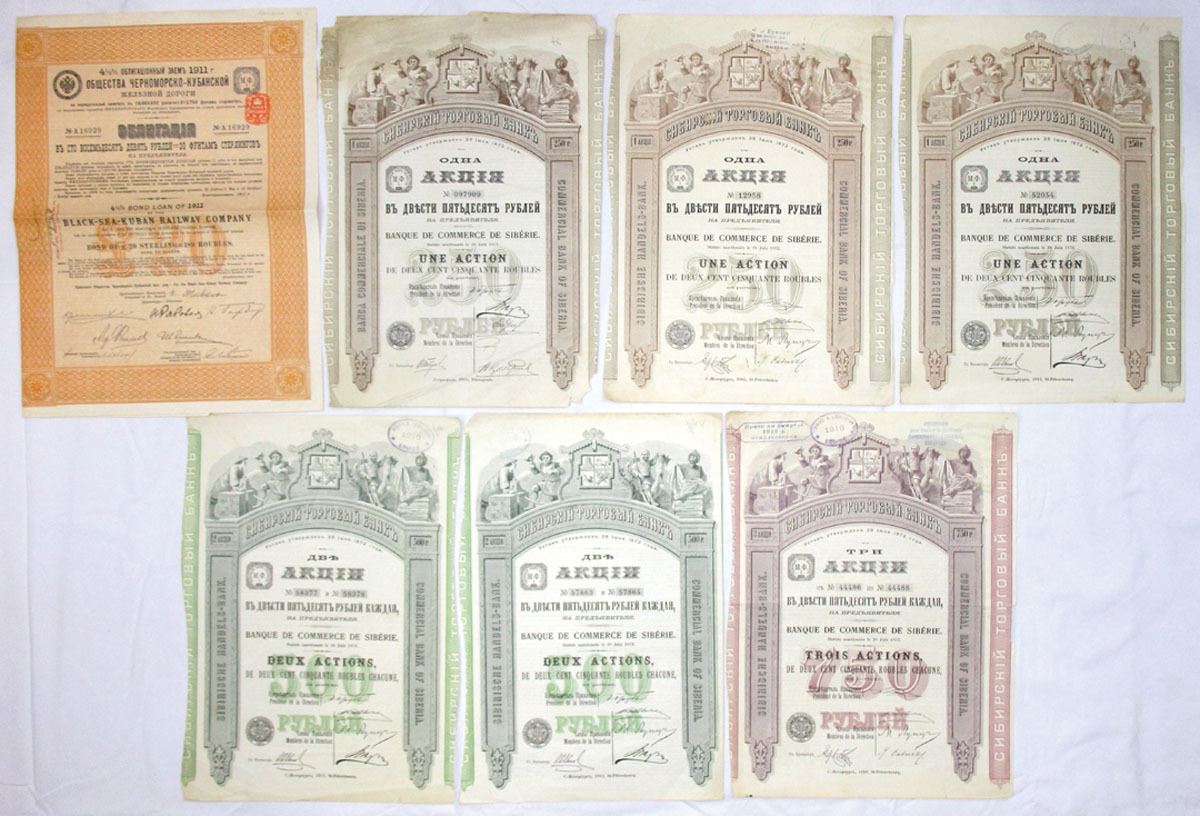 Russia, 1910-12. Lot of 7 I/U stock certificates and bonds representing early 20th-century Russian finance and transportation interests. Includes Black Sea–Kuban Railway Co., 4½% Bond Loan of 1911, and Banque de Commerce de Siberia (Siberian Trade Bank) share certificates in single, double, and triple-share formats, each denominated at 250 rubles per share. Certificates feature bilingual Russian and French text, ornate allegorical vignettes, imperial crests, embossed seals, hand-signed officers, and period cancellations where applicable. Paper tones and border colors vary by issue, with condition ranging from VG to VF overall, showing typical folds, edge wear, and handling consistent with age. (7). Sold “AS IS” no returns accepted.