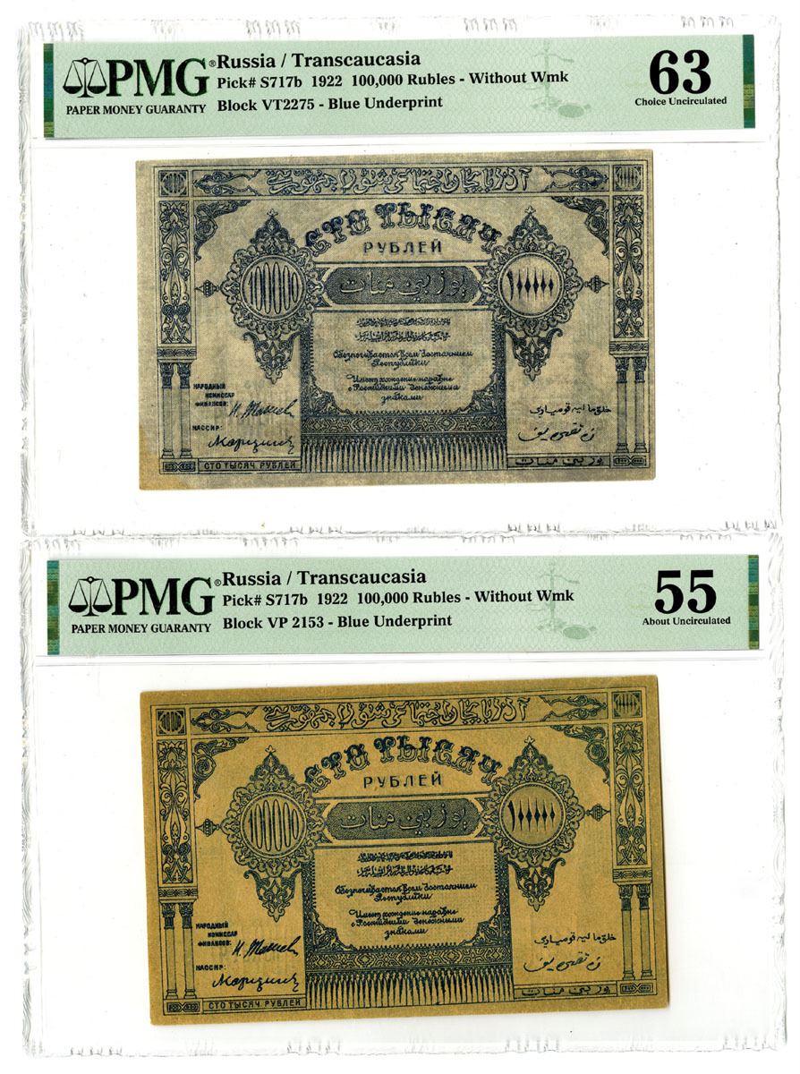 Russia - Transcaucasia, 1922. 100,000 Rubles, P-S717b (2), Issued Banknote Pair, each printed on different colored paper each has Blue printing with decorative borders, Back is Blue and tan with arms at center, Block Numbers VP 2153 and VT 2275, PMG graded from Lowest to Highest: About Unc 55, printed on tan paper; and, Choice Unc 63 with comment "Corner Stain", printed on gray paper. (2). The PMG 63 note is the highest graded note to be offered at auction from this series.