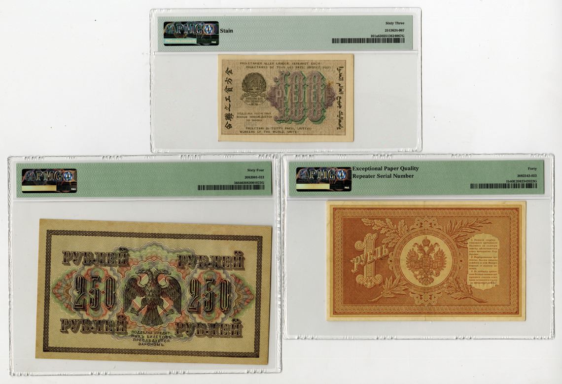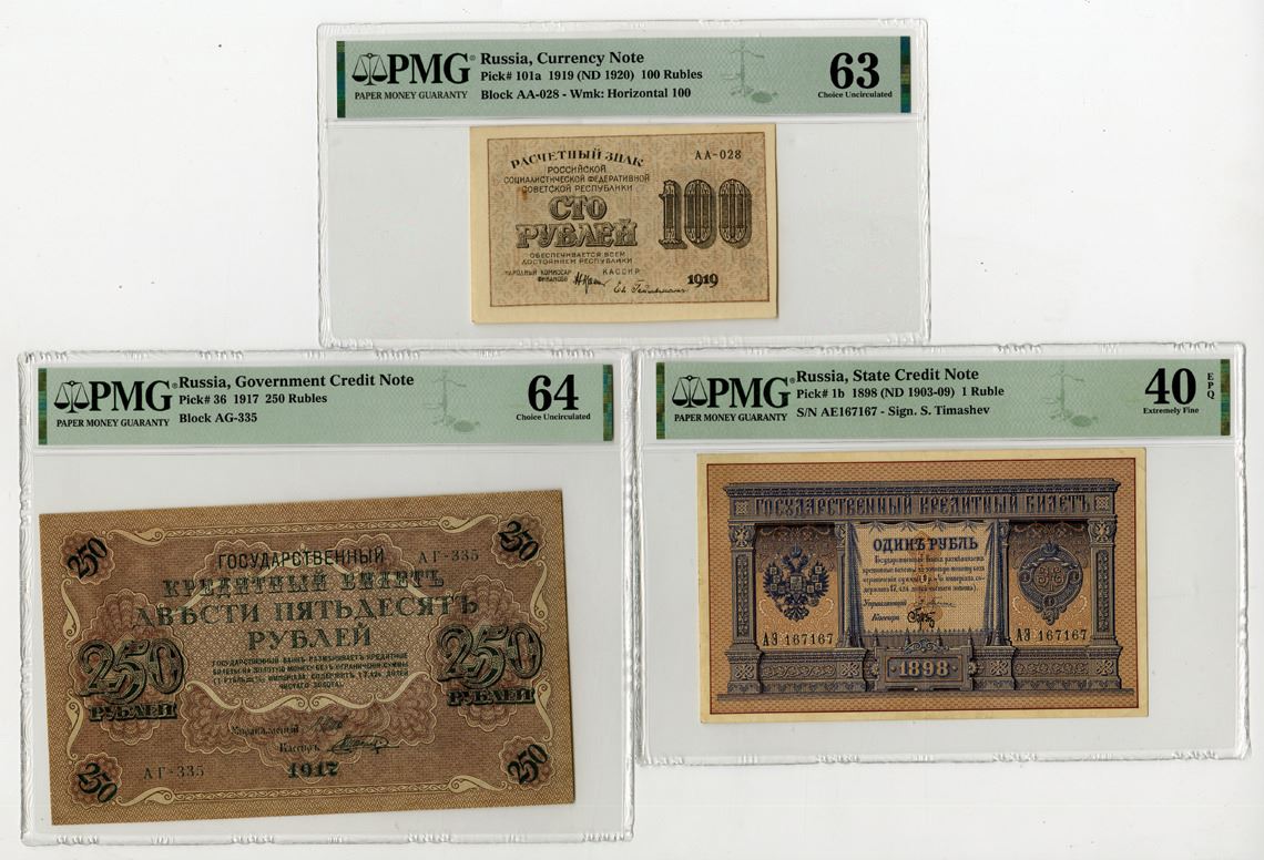 Russia, 1898 to 1919 . Lot of 3 Issued Banknotes, Includes: State Credit Note 1 Ruble, P-1b, PMG Extremely Fine 40 EPQ with comment Repeater Serial Number (AE167167); Government Credit Note 250 Rubles, P-36, PMG Choice Uncirculated 64; and, Currency Note 100 Rubles, P-101a, PMG Choice Uncirculated 63 EPQ with comment "Stain." (3). Sold "AS IS" no returns accepted.