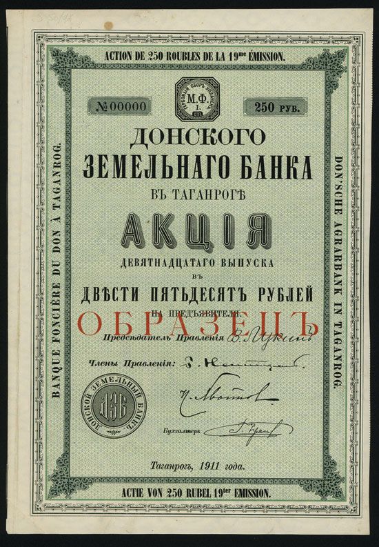 Russia, 1911. 250 Rubles, 19th Emission, Specimen bond, Ò00000Ó serial numbers and red specimen overprints. The bond looks in XF condition but there are 2 small holes from storage in file on the upper and lower left. ÒOBRASETZÓ overprint in red, Rare Russian specimen bond.